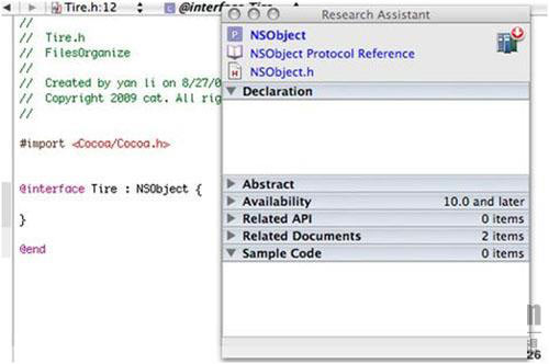 切换到文件Tire.h中,研究助手的浮动窗口就显示有关NSObject的信息: