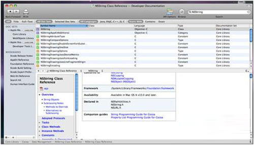 我们可以通过访问苹果公司的官方API文档;方法是按住Option键并双击某个要查看的符号。如我们按住Option键并双击NSString符号将在文档浏览器窗口中打开有关NSString的资料信息,如下图: