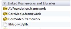 AVFoundation.framwork, CoreMedia.framework, CoreVideo.framework, libiconv.dylib 和libzbar.a (如图)