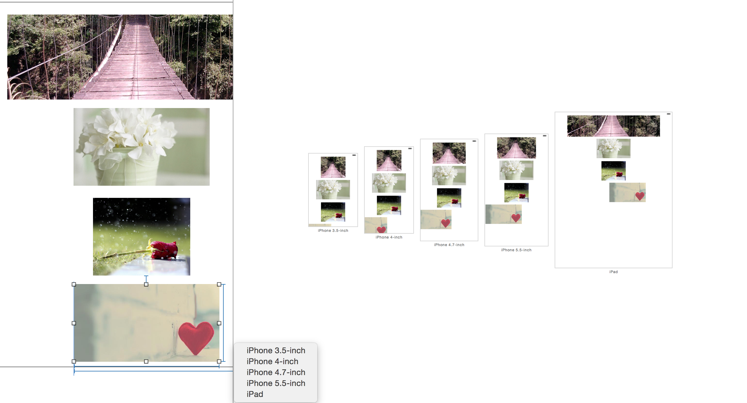 创建一个测试工程,在ViewController上添加4个不同尺寸的UIImageView, 并且添加上不同的约束,最后添加上不同的文艺小清新的图片,最终Storyboard上的控件和约束如下所示。