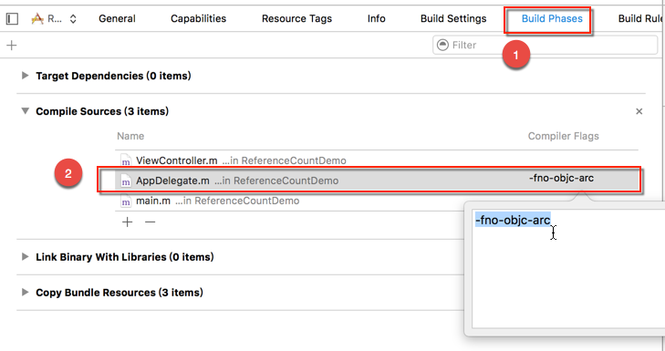 选择目标工程,然后在「Build Phases」的「Compile Sources」下的「AppDelegate.m」文件配置编译器参数「Compiler Flags」值为「-fno-objc-arc」
