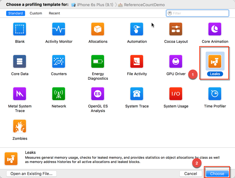 然后选择「Leaks」,再单击右下角的「Choose」按钮进入检测界面,这时点击左上角的「Record」红色圆点按钮开始检测。