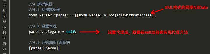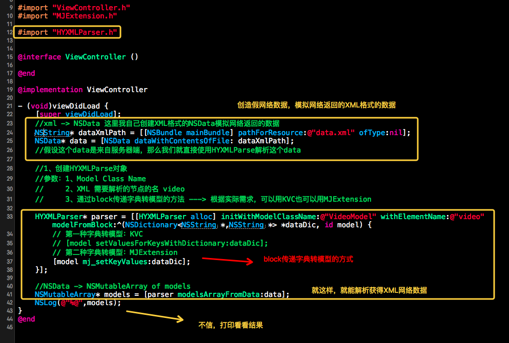 5、关于HYXMLParser使用代码示例图(导入HYXMLParser之后就下面几行代码解析完毕,而且简单易用):