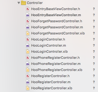 比如上面的的注册和登录模块,就有相同的返回按钮,相同的背景,相同的导航栏样式,甚至相同的按钮和输入框样式。所以为了加快我们的开发,我们完全先定义一个父控制器,然后通过的继承实现多态,从而实现我们快速设计页面和基本功能的实现。下图是我的个人项目《丁丁印记》的登录注册模块的目录结构,其中HooEntryBaseViewController就定义了这个模块通用的行为和样式:
