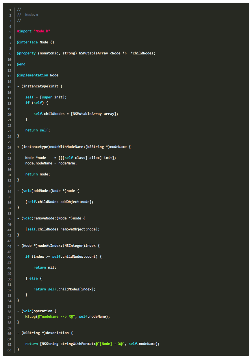 接下来我们通过代码来实现如下图的简单二叉树的结构,当然是用Objective-C来面相对象的实现喽: