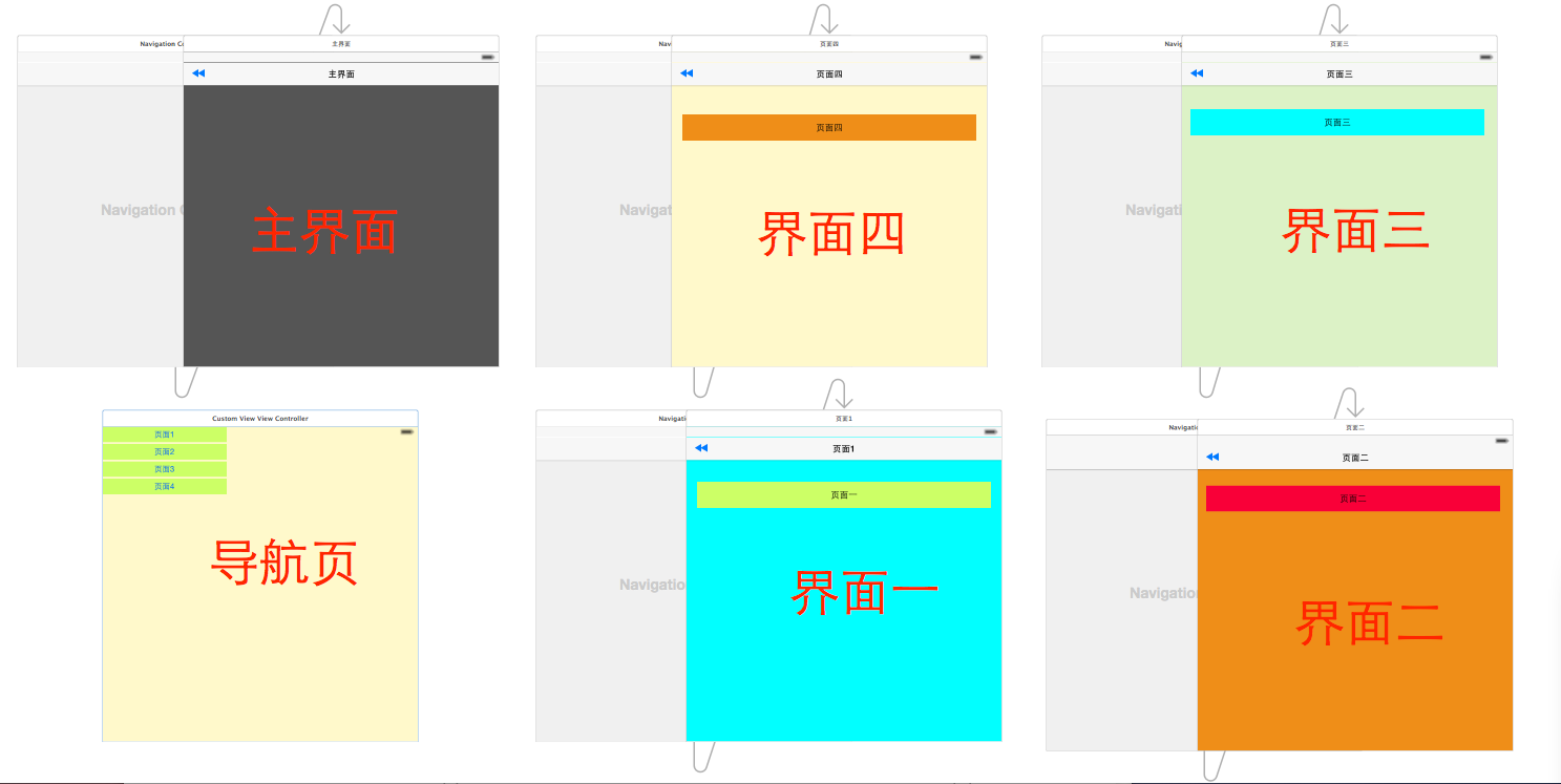 1.在storyboard拖出来我们要用的视图控制器,点击主界面上的按钮会以抽屉的形式展示出导航页,然后在导航页导航到各个界面,之后在从各个页面回到主界面