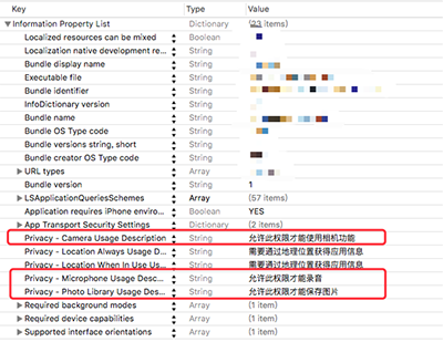 在使用私有权限时,添加Info.plist文件中添加配置: