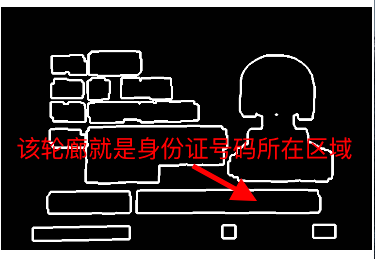 4、轮廊检测:图片经过腐蚀操作后相邻点会连接在一起形成一个大的区域,这个时候通过轮廊检测就可以把每个大的区域找出来,这样就可以定位到身份证上面号码的区域。