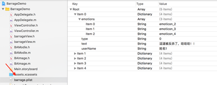 emotions存放这条弹幕的表情,type表示是否是自己发的,text表示弹幕内容,userName表示用户昵称。取出plist文件的数据并转换成model。