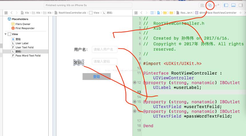 @property (strong,nonatomic) IBOutletUITextField *userTextFeild; (UI与代码就建立了连接)