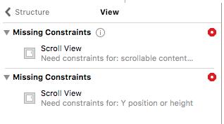 第3步:给ScrollView添加一个ContentView,设置它的上下左右约束,宽度同父布局相等(宽度也可以不相等),高度暂时先不设定,因为后期要用这个特性让其高度自适应内容,这个时候我发现小红箭头报错。