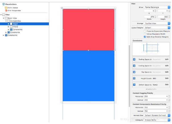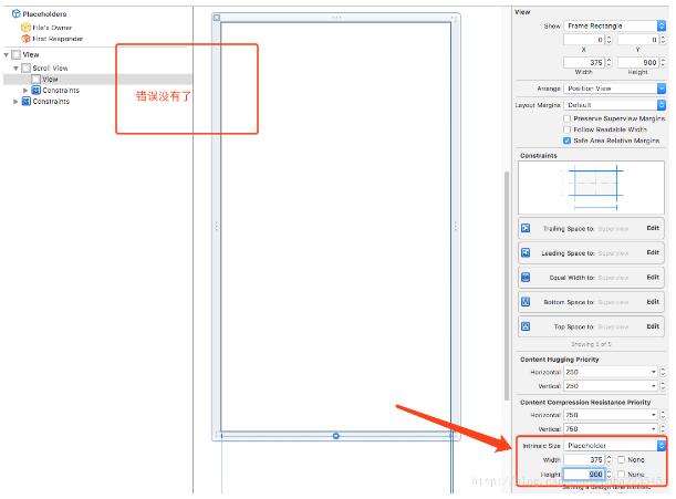 第4步:因为高度没有确定所以会报错,加一个固定大小(intrinsic size) ,这个约束报错就没有了。当当程序运行时ContentViw的 size 会根据你的约束重新改变,intrinsic size并不会影响你的约束。