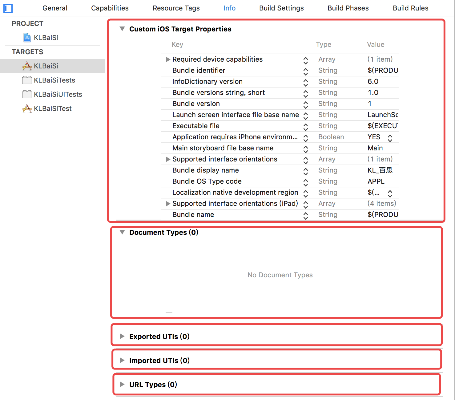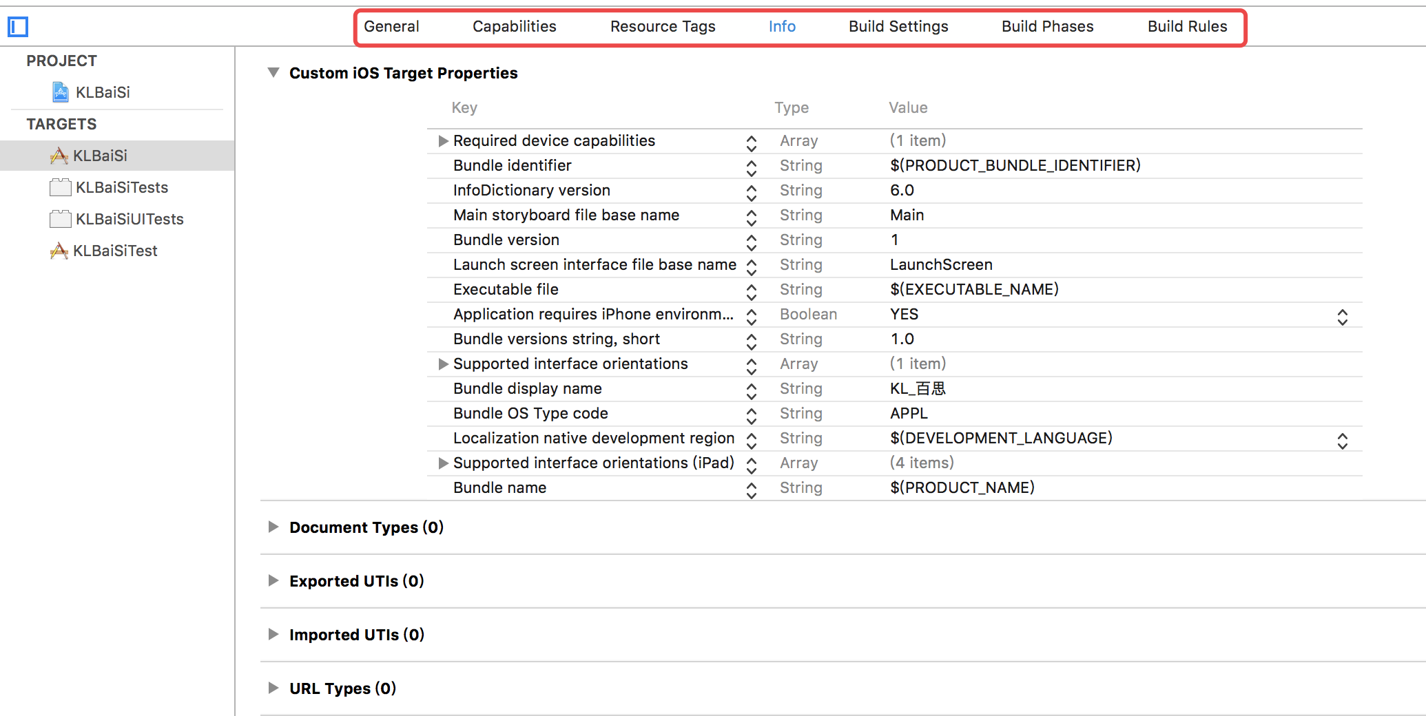 在这一部分,最重要的就是第一部分Custom iOS Target Properties自定义iOS目标属性,其他的四个部分基本上都不怎么用,大家不用管就好了。在target的info选项卡中的五项信息与我们项目资源目录下的info.plist文件中的内容是一致,并且修改其中一个另一个会自动修改。此外,我们在2.2.1中讲到的general选项卡中的一些设置也会对应到info.plist文件中,所以这些内容都是相通的,我们修改一处,其他的地方会同步次修改。info.plist中其实加载的信息会非常多,上面是创建项目之后自动生成的一些最基本的设置选项,每一项对应的意思如下解释: