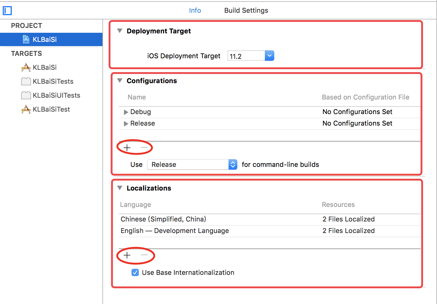 Deployment Target:部署配置,主要是对本project的生成的App的可以运行的最低版本进行配置,默认是当前Xcode上API的最新版本,所以,在我们的项目中有需要对低版本适配的地方需要在这里设置。同样的,我们还可以在build setting中对这一属性进行设置,两者是同步的。 Localizations:本地化,这里的功能主要是添加我们的App所支持的语言,通过上图最下面的红色圈内的【+】【-】按钮可以添加或删除不同的语种,并可以选择根据手机的设置进行不同语种的自适应。关于最下面的选择是否开启国际化,默认是开启的
