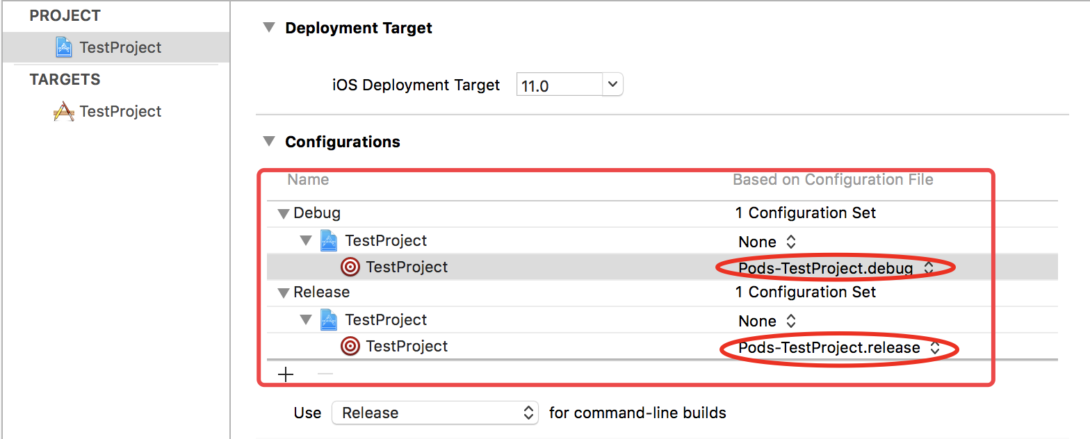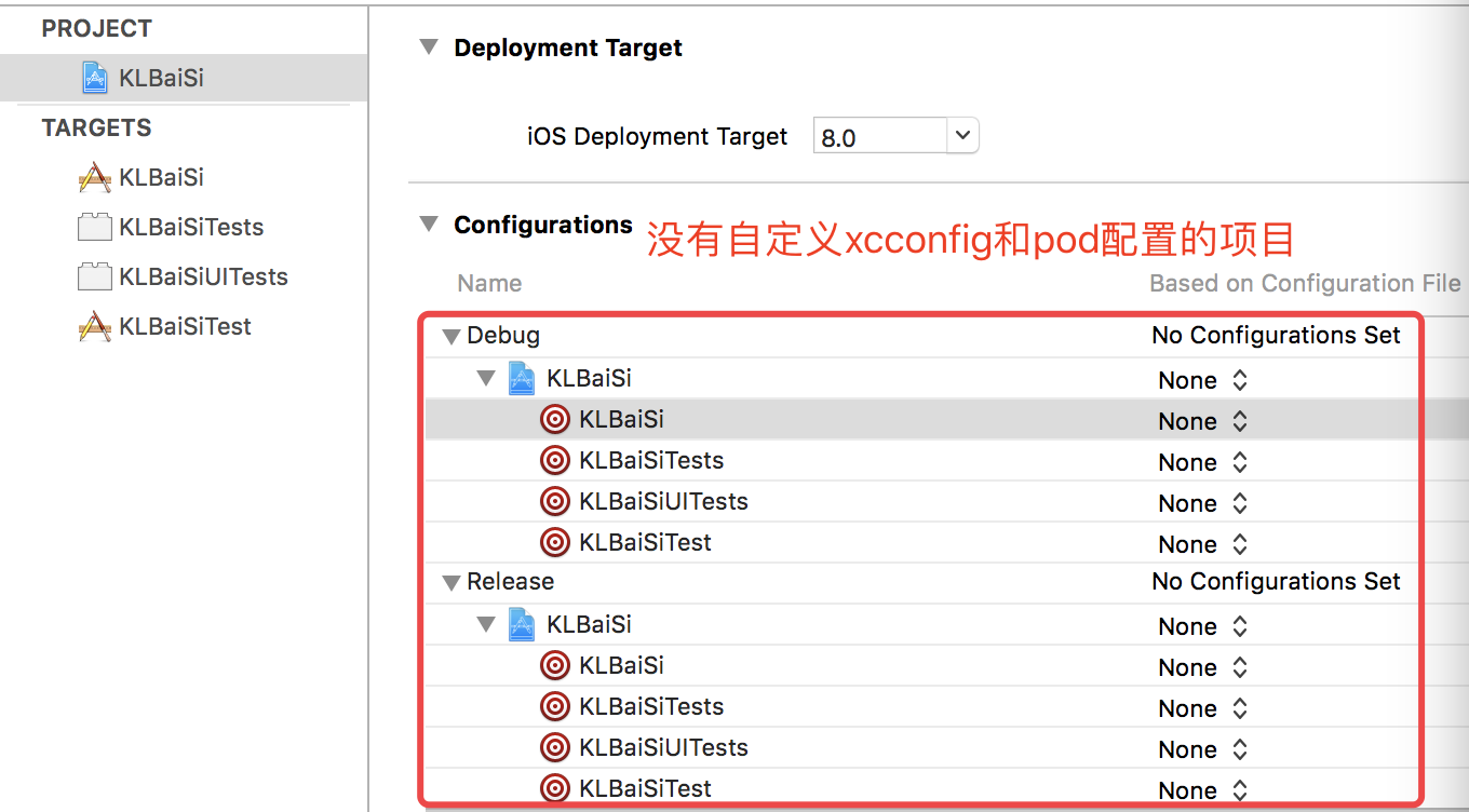 Configurations:用来配置iOS项目的xcconfig文件,主要用于在几套不同的开发环境编译。xcconfig文件其实就是xcode里的config文件,本质是一个用来保存Build Settings键值对的纯文本文件。这些键值对覆盖Build Settings中的值,所以当在xcconfig文件中配置了的选项,在Build Settings中设置将失效。我们在项目中一般不会进行xcconfig文件的自定义。具体xcconfig文件是什么东东,大家可以查看:iOS之Xcconfig杂谈 。估计很多新入门的iOS开发对xcconfig文件都不是很熟悉(其实我也不是很了解。。。), 但是大家可能都用过Cocoapods, 其实Cocoapods的项目配置管理很多都是依赖xcconfig文件去实现的。所以在使用Cocoapods进行导包的项目中,我们通过打开.xcworkspace文件,我们会发现project-->info-->configutations下的都有对应的配置文件,而原先没有用Cocoapods配置的则没有相关的配置文件,具体区别如下图所示。