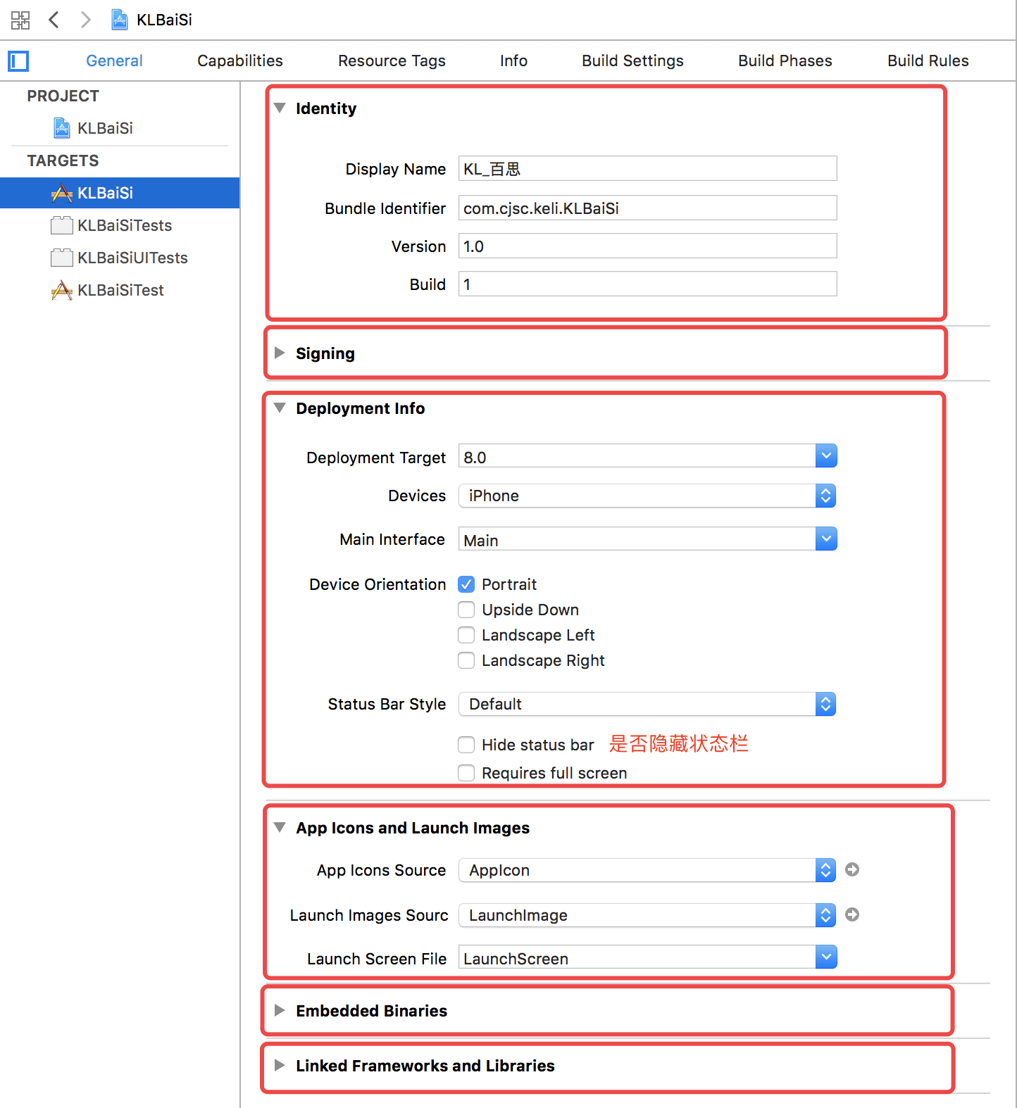 启动页面在屏幕适配中的作用:每个机型,比如同时支持iPhone和iPad的程序,需要分别为iPhone跟iPad指定启动图片。当旧的iPhone 4的程序,运行在iPhone 5上面,没有iPhone 5的启动图片,就采用兼容模式,上下留黑边。当为iPhone 5指定了新的启动图片,系统就认为这个应用程序是已经适配了iPhone 5的。当旧的iPhone 5程序运行在iPhone 6上面,假如没有经过适配。旧程序自动等比放大,铺满新手机,旧程序也可以正常运行。这种方案可算是自动适配。但因为旧程序拉伸了,整体看起来有点虚,也不能更好利用大屏空间。当需要开发者手动适配的时候,跟iPhone 4过渡到iPhone 5一样,在新程序中,指定一张新的启动图片。当指定了启动图,系统就认为应用已经做好了屏幕适配,屏幕分辨率就变成应有的大小。在某机型上,如果是自动适配,比如iPhone 5,老版程序就会在屏幕上、下俩端多出俩块黑条;比如iPhone6/6plus,老版程序就会自动等比拉伸。那如何关闭自动适配?指定启动图或者使用Launch Screen File.xib,即程序使用手动适配,不会做拉伸等,但是程序内部必须已做处理,否则使用自动适配方案。 Embedded Binaries(绑定二进制文件):用来连接二进制文件,一般在使用第三方SDK的时候使用。 Linked Frameworks and Libraries(链接的框架和库):选择要链接的框架和库,既可以是SDK自带的框架,也可以是第三方框架,在Build Phases中也有类似的功能选项。