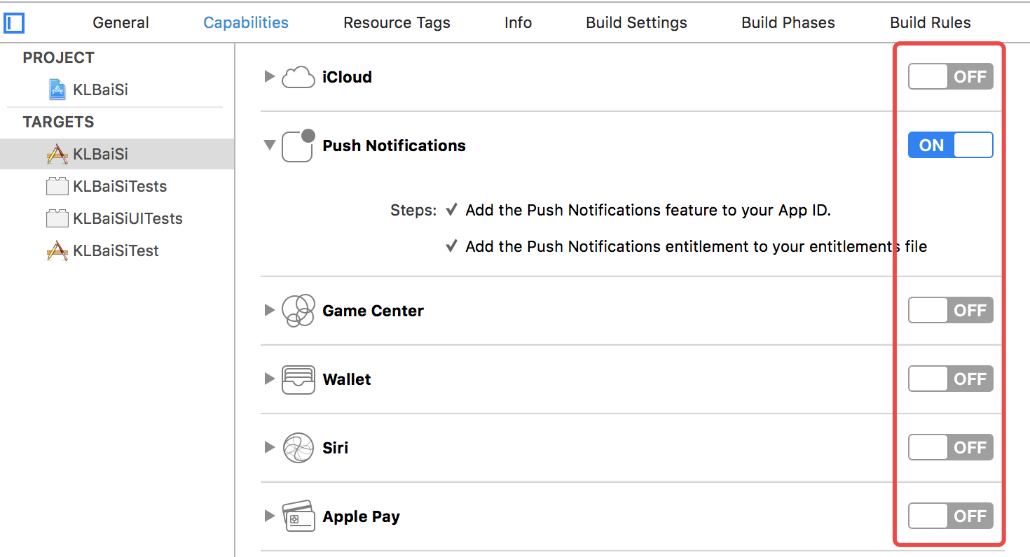 target的capabilities属性设置这一块主要是一些性能设置开关选择,例如推送通知、云存储、游戏中心、后台模式等,我们选择需要的开关进行打开或者关闭,这些相应的状态都会在info.plist中进行修改。所以,同样的,我们也可以在info.plist添加一些权限或性能开关之后,在target的capabilities中也会进行相应的修改的。具体的界面如下图所示:
