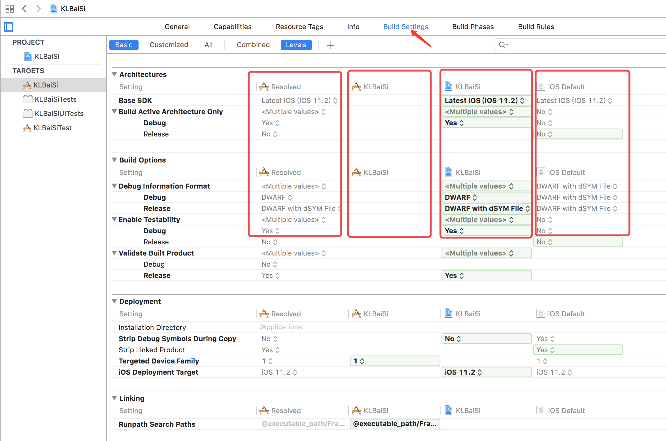 target的build setting选项卡的是最主要的一部分编译选项设置,配置界面如下图所示,界面只是截了一部分,完整的build settings共有20项配置内容。从配置界面上看,每一项的配置都有四列,我们可以看到,从左至右的顺序分别是:Resolved列、带Target图标列、带Project图标列、iOS Default列,每一列所代表的意义如下。