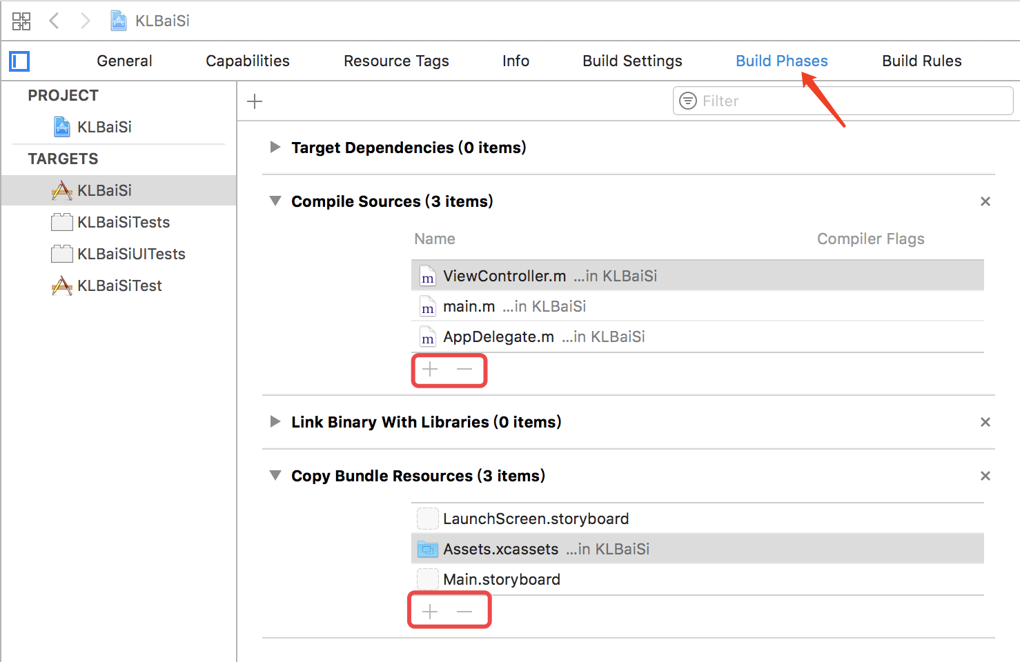 Target Dependencies Target对象依赖阶段:某些Target可能依赖某个Target输出的值,这里设置依赖。依赖于其他target的输出的时候,在编译时系统会自动先编译被依赖的target,得到输出值,再编译当前target。对象依赖阶段可以让Xcode知道必须在当前选择的对象编译之编译的其它依赖对象(比如应用扩展、插件等等)。这个阶段是无法被删除的。 Compile Sources 源文件编译阶段: 是指将有哪些源代码被编译,可以通过红框中的【+】【-】按钮进行添加或删除资源来控制编译的代码文件。并且可以通过修改改阶段的Compiler Flags(编译器标识)来为每个单独文件设置其编译器编织,比如优化设置等等。 Link Binary With Libraries 链接二进制库阶段:是指编译过程中会引用哪些库文件,我们同样可以通过【+】【-】按钮进行添加或删除编译所引用的库文件。 Copy Bundle Resources 复制资源文件阶段:是指生成的product的.app内将包含哪些资源文件,同样可以通过红框中的【+】【-】按钮进行添加或删除资源来控制编译的资源文件。该阶段定义了对象中的资源文件,包括应用程序、图标、界面构造器、视频、模板等等。这些资源都会被复制到安装包的Contents/Resources文件夹下。