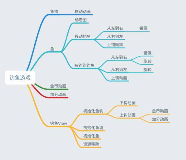 首先我们看下思维导图,本游戏主要分为4大块,其中鱼的实现最为复杂
