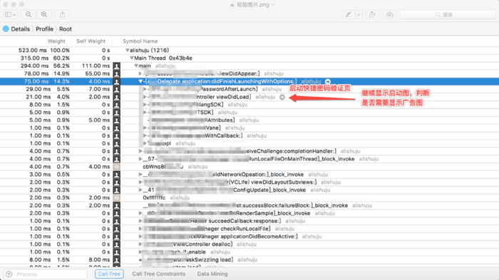 其中目前耗时最多的是快捷密码验证页(PAPasscodeViewController)的创建&布局,其次是DTLaunchViewControlle里对是否要显示广告页的判断代码。可以看到PAPasscodeViewController的viewDidAppear耗时了78ms,但已经没有太大关系,此时用户已经看到了页面,准备去验证指纹/密码了。