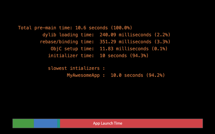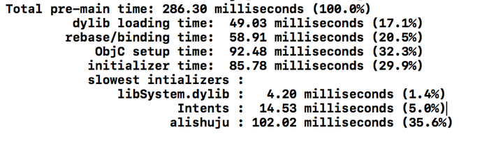 设置好后把程序跑起来,控制台会有如下输出,pre-main阶段各过程的耗时一览无余(Apple这个Demo有点过于夸张...)