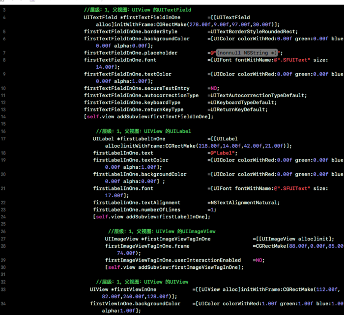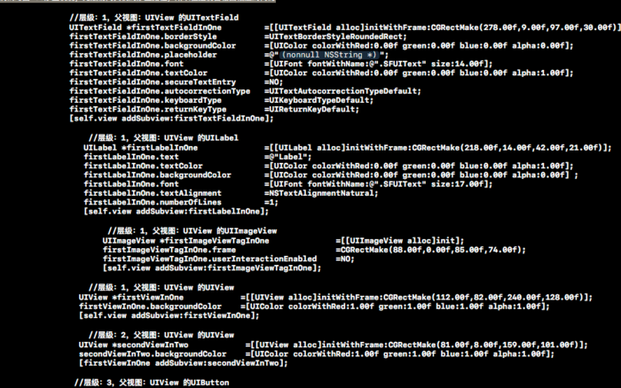 最近公司写了一新项目,写完项目总结时发现,大部分时间都浪费在纯代码写一些简单的控件上,用xib布局吧,还怕为后期的维护给自己挖坑,总是纠结到底用纯代码,还是xib呢,纠结来纠结去突然灵感乍现? 为什么不能用xib布局,让它自动生成相应的代码呢,安卓就有这类似的功能- -!!想到就着手开干,写了一个自动生成的工具,废话不多说介绍下我自己写的小工具