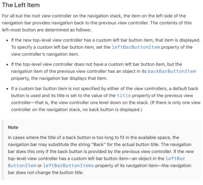 有leftBarButtonItem则优先显示当前VC的leftBarButtonItem,无则显示上个VC的backBarButtonItem,再无则显示上个VC的title(参考官网 还是官网解释的清楚)