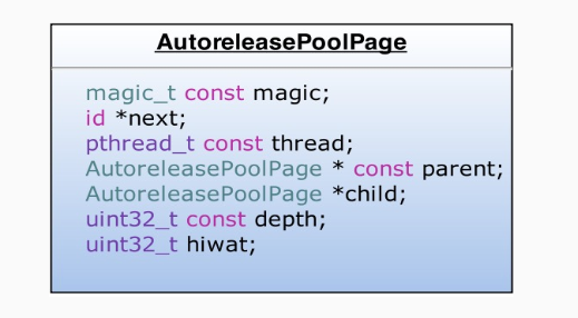 NSAutoreleasePool是通过以AutoreleasePoolPage为结点的双向链表来实现的。AutoreleasePoolPage是一个C++实现的类,类结构如图: