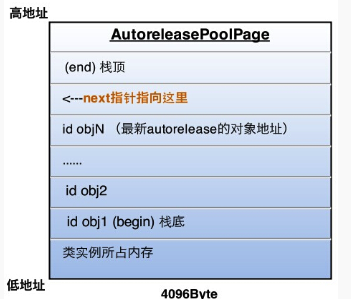 AutoreleasePoolPage每个对象会开辟4096字节内存(也就是虚拟内存一页的大小),除了实例变量所占空间,剩下的空间全部用来储存autorelease对象的地址。内存结构如图: