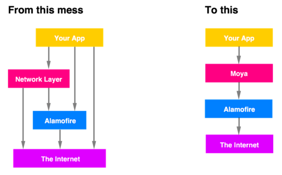 Moya是你的 app 中缺失的网络层。不用再去想在哪儿(或者如何)安放网络请求,Moya 替你管理。