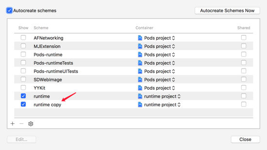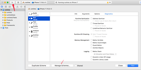 8、按着键盘 option ,点击 Xcode 运行按钮(左上方),然后点击 Manage Schemes