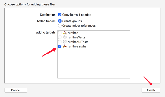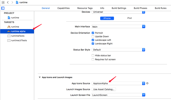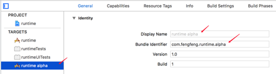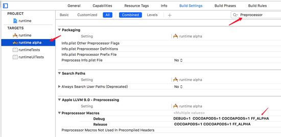 这可以通过,预编译宏来区分,比如在 runtime alpha 的 target 的 Build Settings 中,在 Preprocessor Macros 中添加 FF_ALPHA