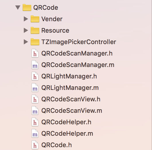 如图中代码目录,vender里面放的是UIView+Frame分类,Resource里面放的是图片声音资源,TZImagePickerController是第三方相册,用来获取相册中的二维码识别的。主要的就是以QR开头的文件,我们具体说一说。