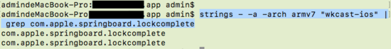strings - -a -arch armv7 "工程名" | grep com.apple.springboard.lockcomplete