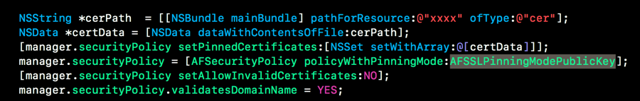 SSL Pinning的实现比较简单,只需要把CA证书放入项目中,通过Security framework实现NSURLSession上的SSL Pinning。如果用的是AFNetworking,代码更简单一点: