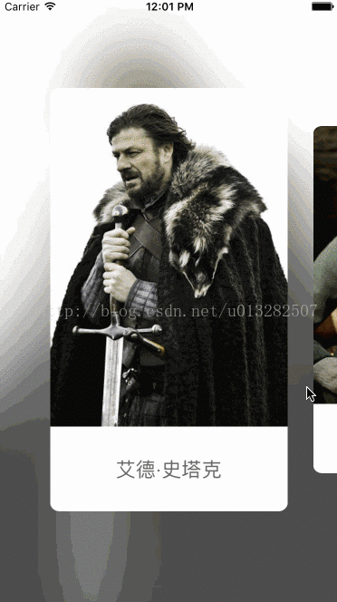通过拖拽屏幕实现卡片移动,左右两侧的卡片随着拖动变小,中间的变大。效果如下: