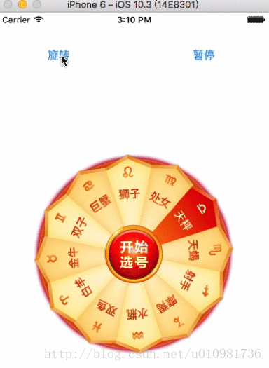 功能:实现了常用的iOS转盘效果,轮盘抽奖效果的实现,转盘可以暂停,旋转,已经快速旋转抽奖,选中的效果指向正上方。