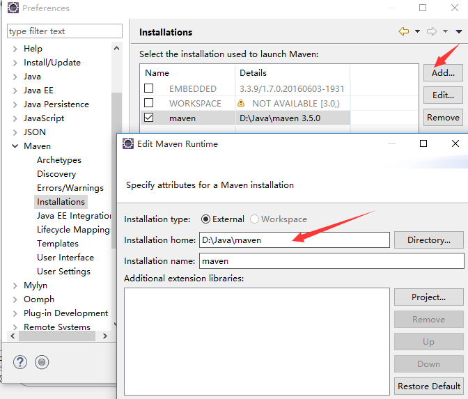 点击Installations节点,添加maven runtime