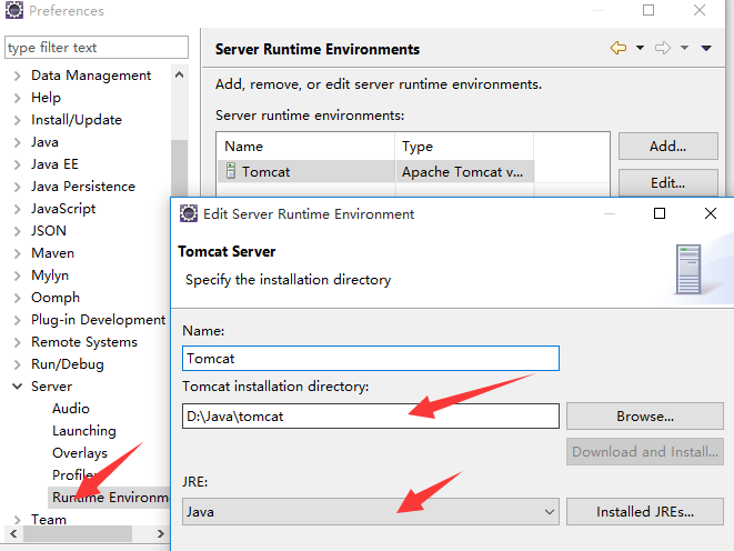 在eclipse中设置Server为Tomcat,注意JRE设置为安装的JDK的jre
