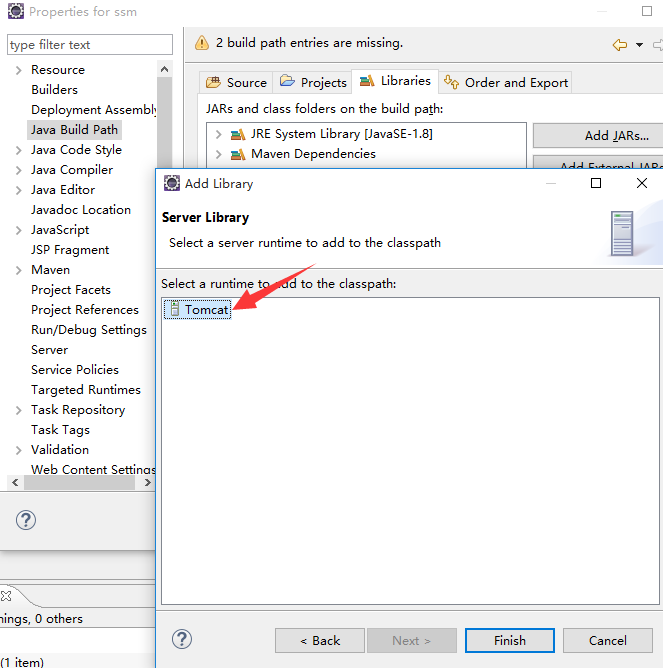 在工程上右键,查看工程属性,找到Java Build Path,添加Server Runtime为Tomcat
