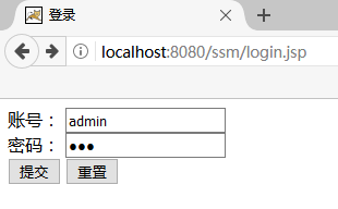 <%@ page language="java" contentType="text/html; charset=UTF-8" pageEncoding="UTF-8"%> <!DOCTYPE html PUBLIC "-//W3C//DTD HTML 4.01 Transitional//EN" "http://www.w3.org/TR/html4/loose.dtd"> <html> <head> <meta http-equiv="Content-Type" content="text/html; charset=UTF-8"> <title>登录</title> </head> <body> <form action="user/login" method="post"> <label>账号:</label> <input type="text" id="txtUsername" name="username" placeholder="请输入账号" /><br/> <label>密码:</label> <input type="password" id="txtPassword" name="password" placeholder="请输入密码" /><br/> <input type="submit" value="提交" /> <input type="reset" value="重置" /> </form> </body> </html>