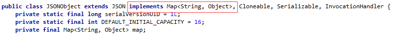 我们可以把JSONObject当成一个Map<String,Object>来看,只是JSONObject提供了更为丰富便捷的方法,方便我们对于对象属性的操作。我们看一下源码。