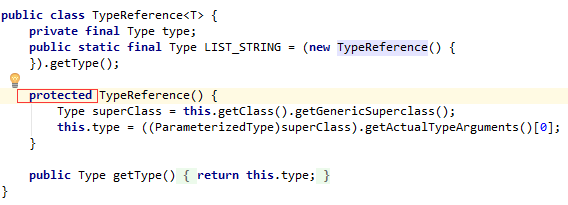对于TypeReference<T>,由于其构造方法使用 protected 进行修饰,所以在其他包下创建其对象的时候,要用其实现类的子类:new TypeReference<Teacher>() {}