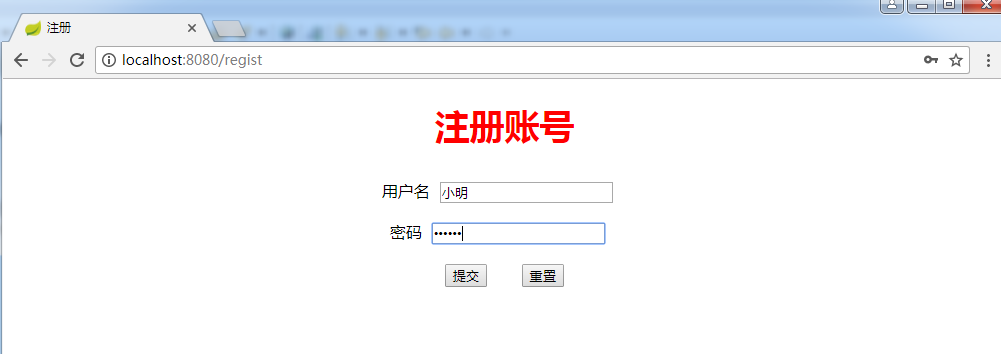 此时,直接运行Apptest.java,然后在浏览器输入地址:localhost:8080/regist 注册新的账号(我输入的是用户名:小明 密码:123456),如图