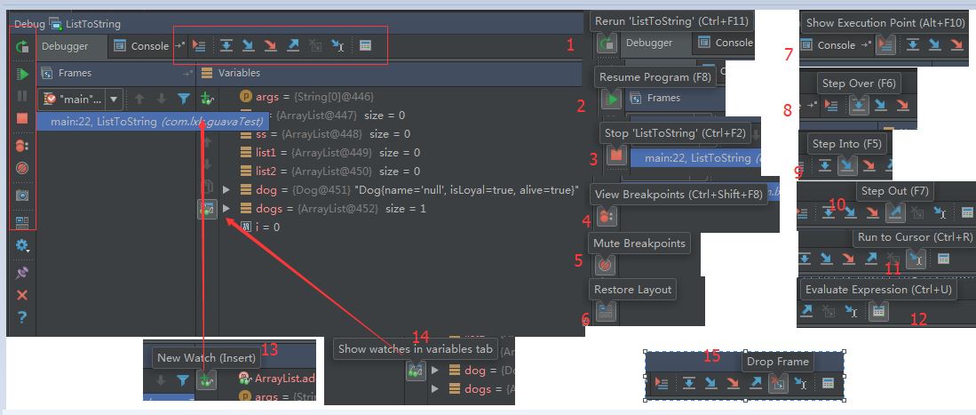 15,有时候当我们步入方法体之后,还想回退到方法体外,点这个按钮后,断点重新回到方法体之外。在继续还是可以再次进到方法内