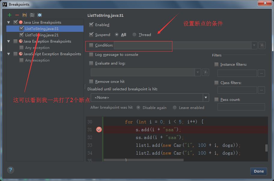 关于设置断点条件,还可以,直接在代码断点处,右键设置,完啦之后,done,设置完成。