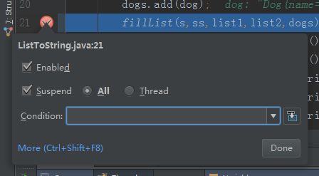 在图中condition中可以设置断点的条件,当i==4的时候,才停下。查看具体断点内容。