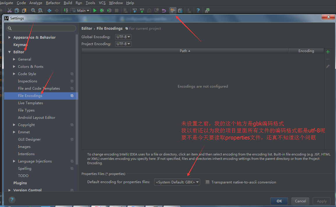 在这之前,我一直以为,我已经设置了我这个编辑器下的所有文件的编码格式都是utf-8,直到我这次要读取properties文件的时候,才惊讶的发现,我的properties文件并不都是utf-8的文件编码格式。然后,我就在读取文件的时候,当配置文件内部有中文的时候,就出现了乱码。