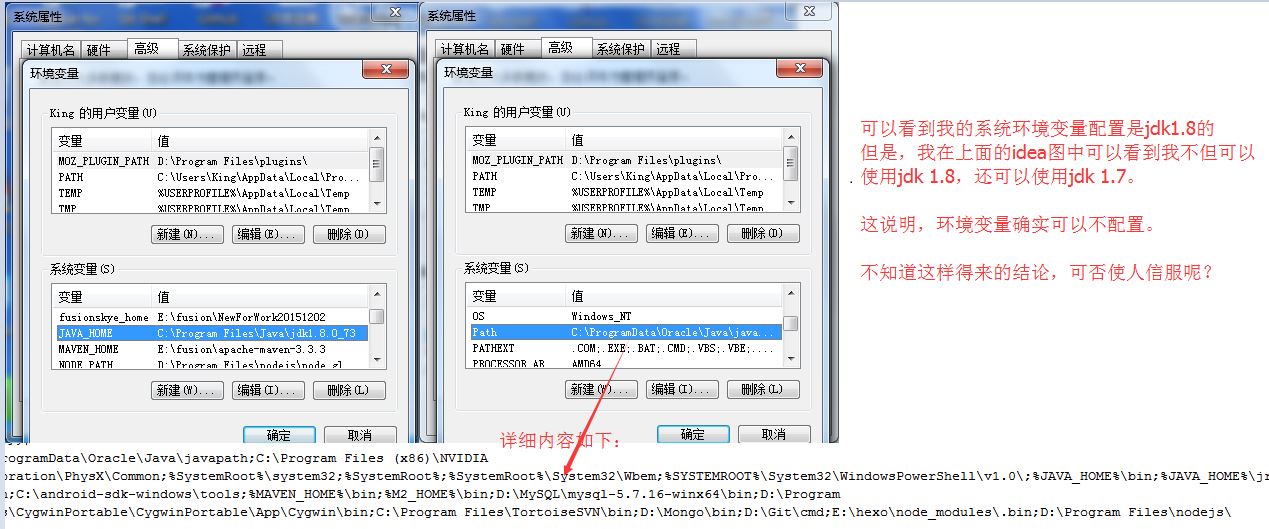 要按某些同学说的那样的话,我在使用jdk 1.7的时候,我是不是得回来这,修改下环境变量,修改成对应1.7的位置之后,才可以使用jdk1.7.但是,事实上,我并不需要去修改这个环境变量,就可以直接使用,jdk1.7,虽然我的环境变量配置的是jdk1.8的,